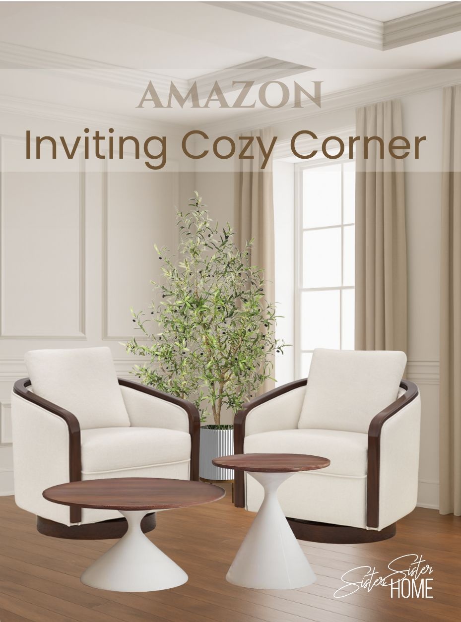 Create an inviting cozy corner with modern swivel chairs, nesting tables, and warm tones—perfect for reading, relaxing, or conversation in style.
