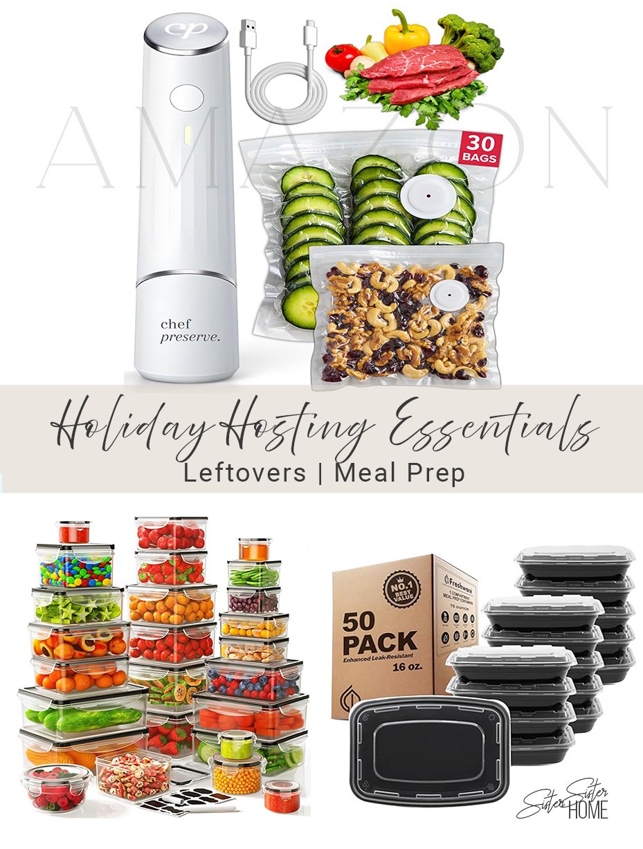 Holiday hosting essentials for leftovers and meal prep—vacuum bags, glass containers, and take-home containers to keep food fresh, organized, and ready to share.