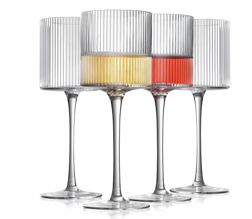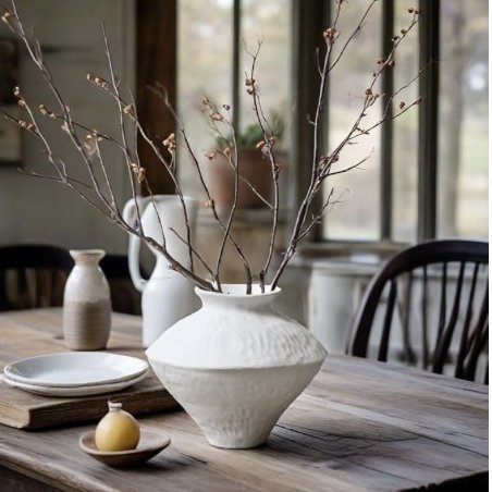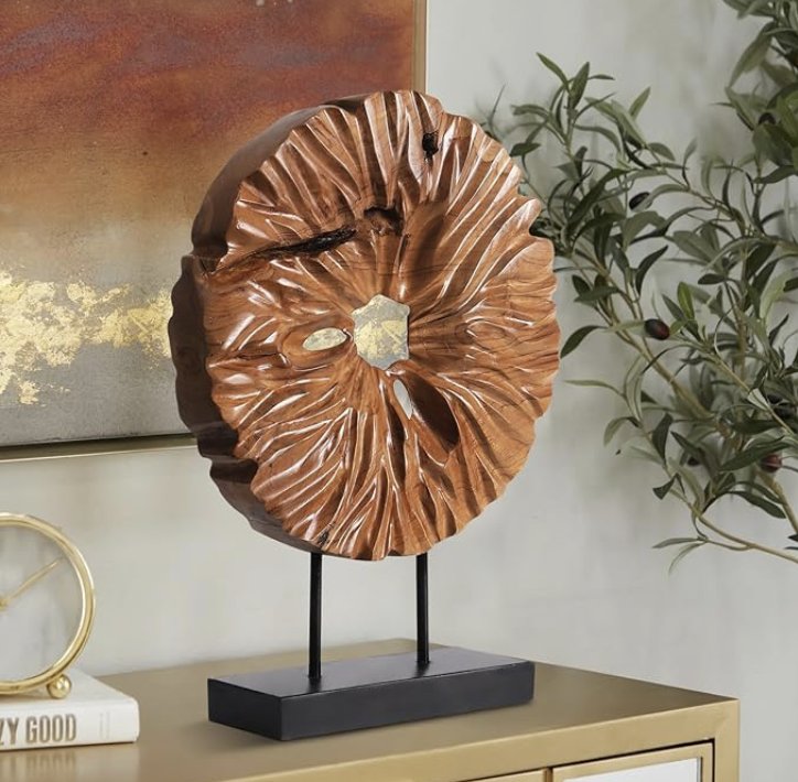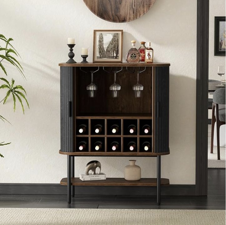 Moody organic modern cocktail bar with fluted cabinet, warm wood, and sculptural decor—perfect cozy space for entertaining.