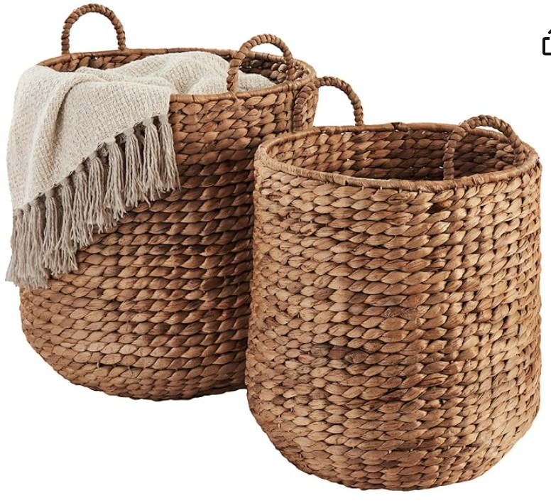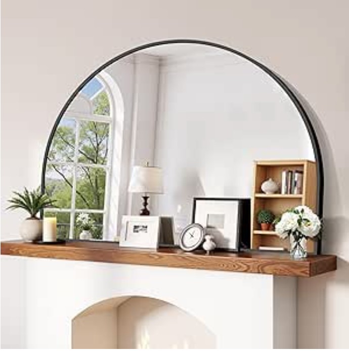 Modern entryway decor with warm wood, black accents, woven textures, baskets, console table & arched mirror.
