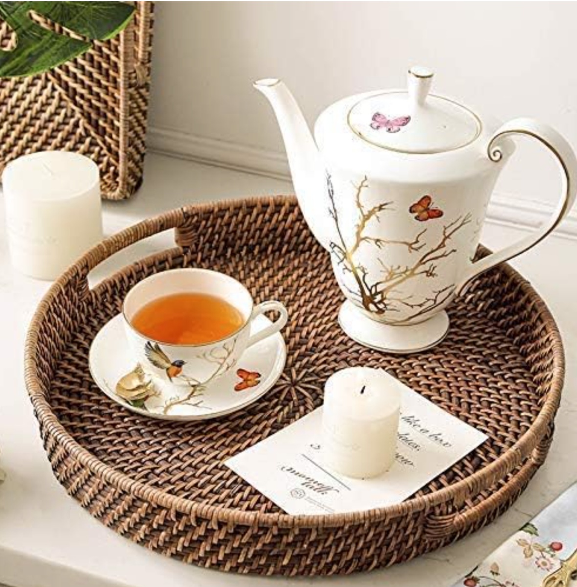 Handwoven round rattan tray adds organic warmth to any space — ideal for kitchen counter styling, serving tea, or layering decor in your home.
