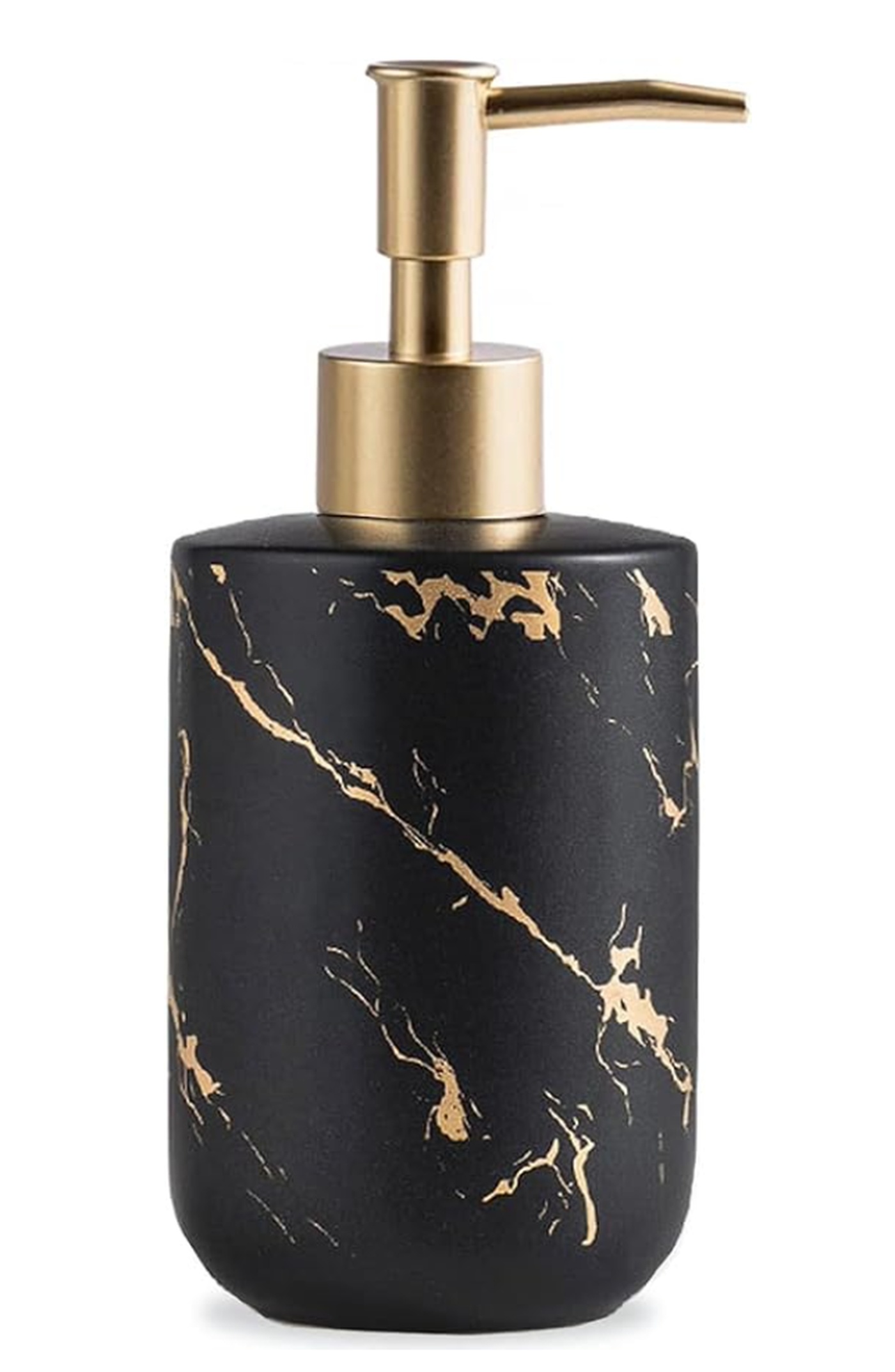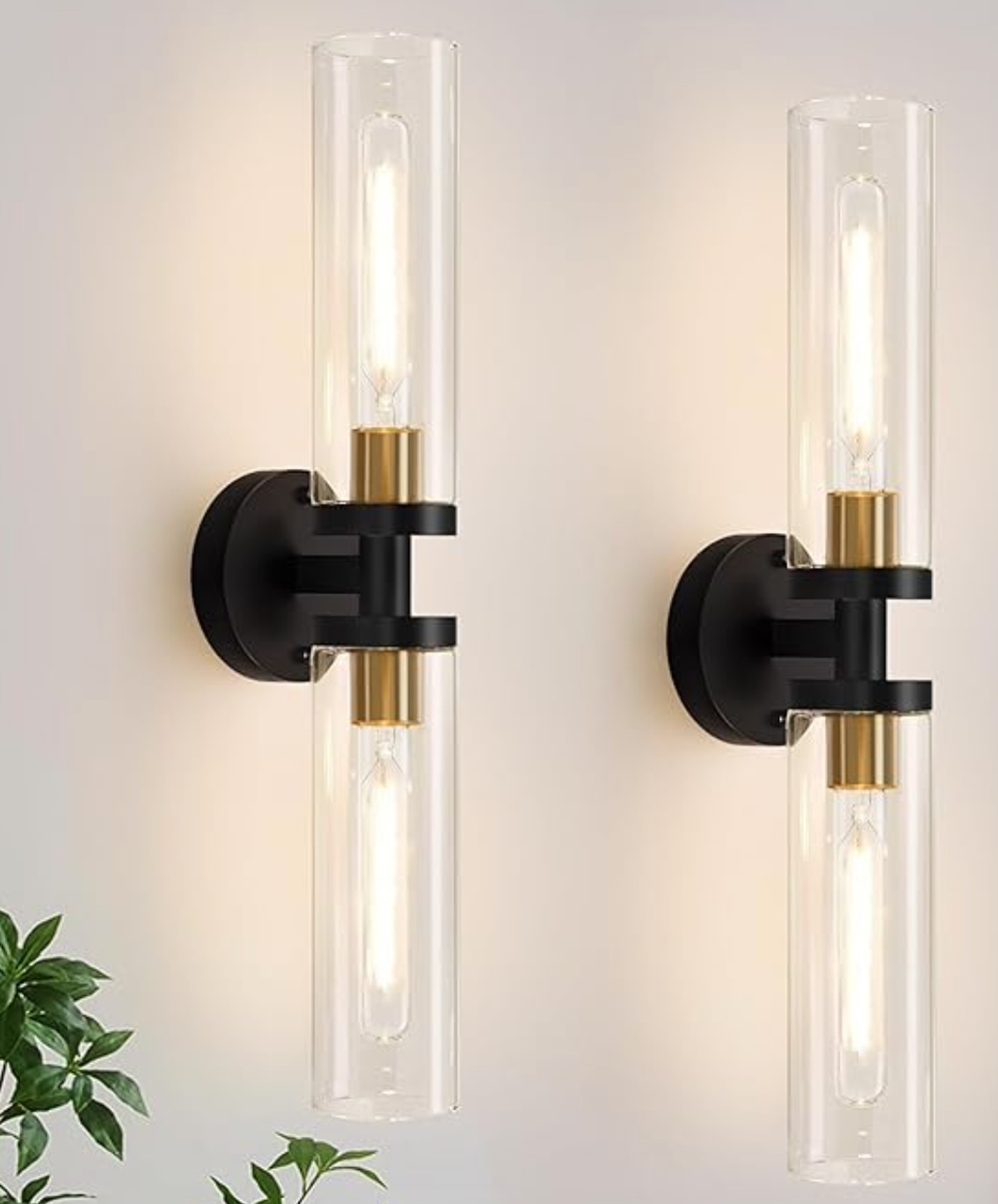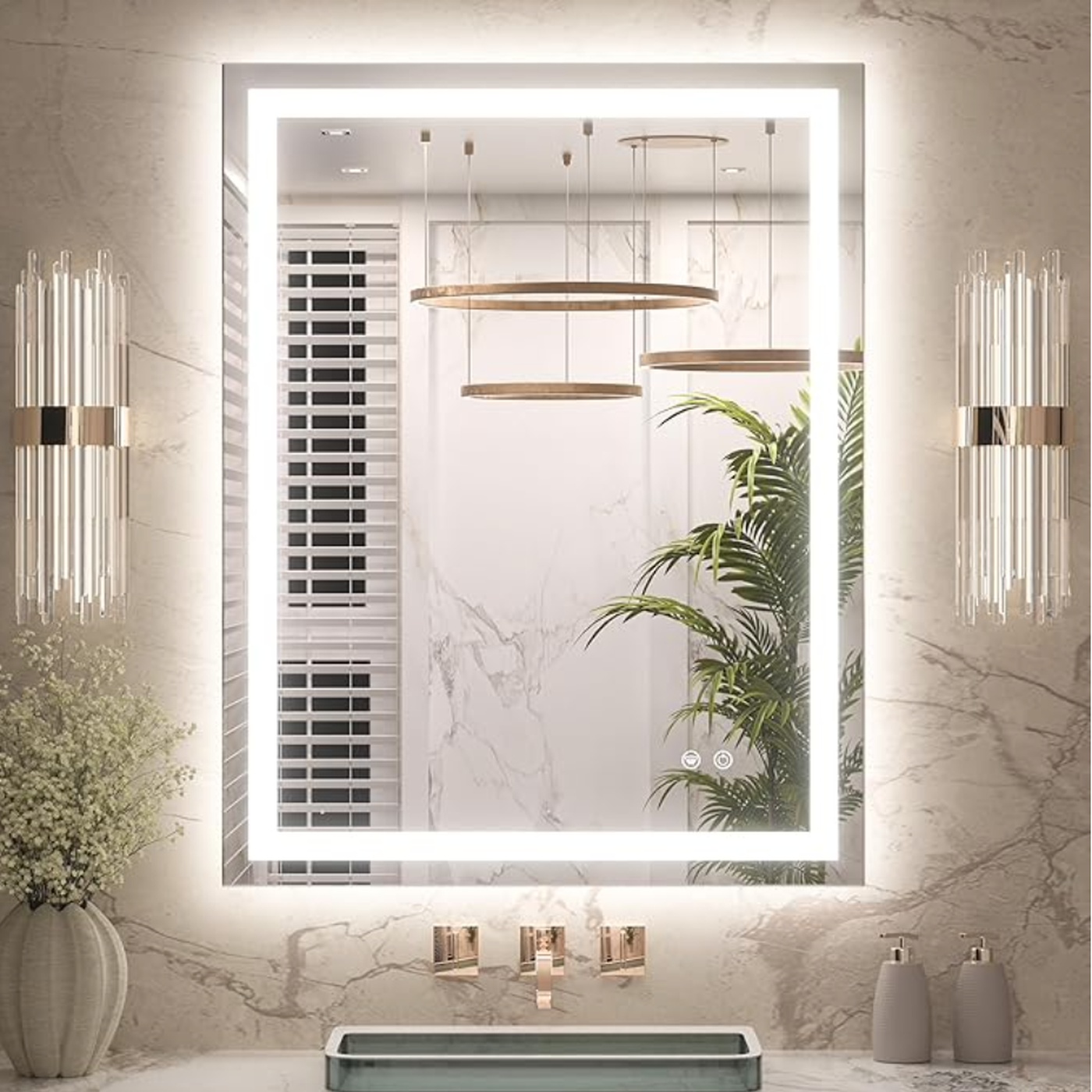 Create a luxurious bathroom retreat with a modern LED mirror, chic black and gold sconces, and elegant accessories for a timeless, spa-like feel.