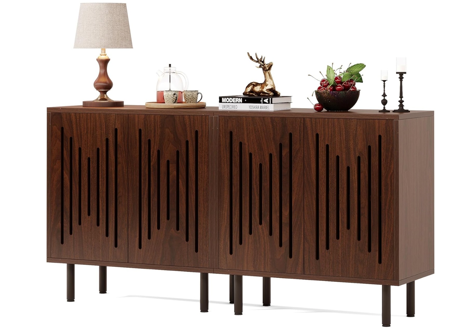 Sleek walnut sideboard with vertical slat doors and modern black legs. Perfect for dining rooms or entryways seeking minimalist, mid-century warmth.