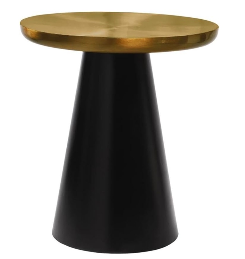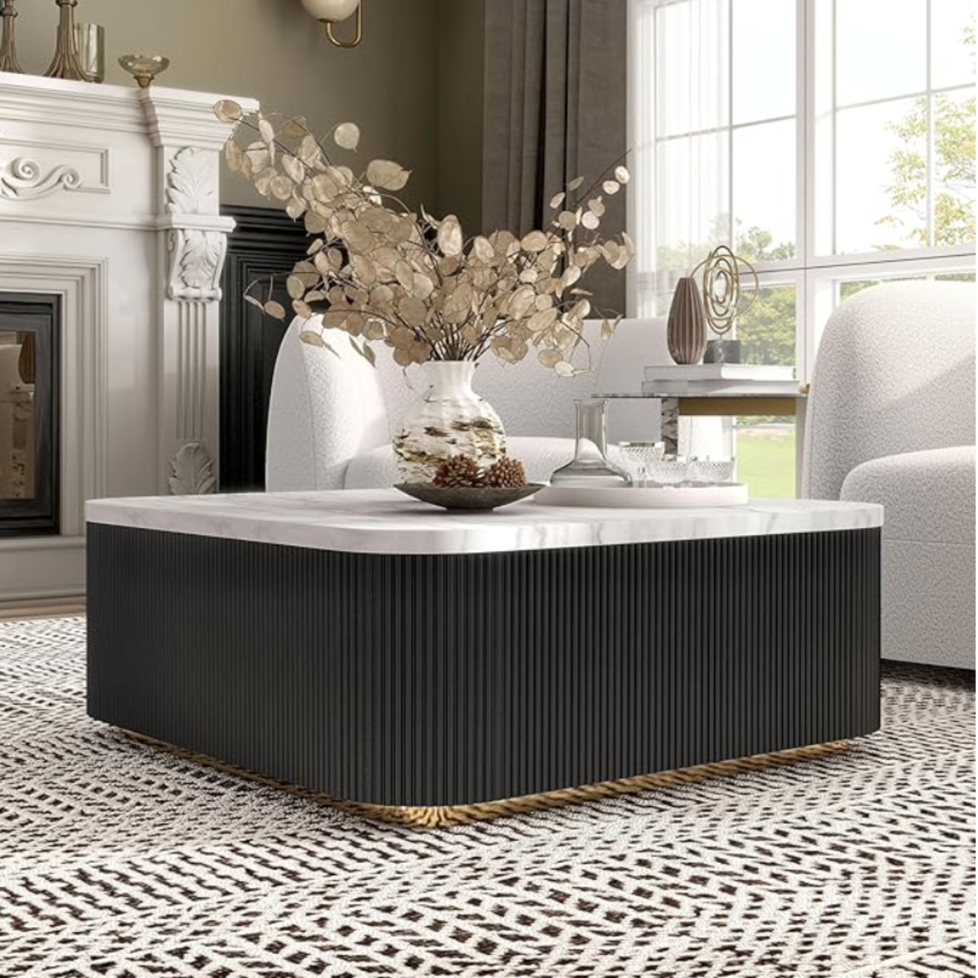 Modern marble & brass living room with modern curved sofa, genuine marble-top table with brass-tray styling, luxe end table, & gold-accented sculptural decor.