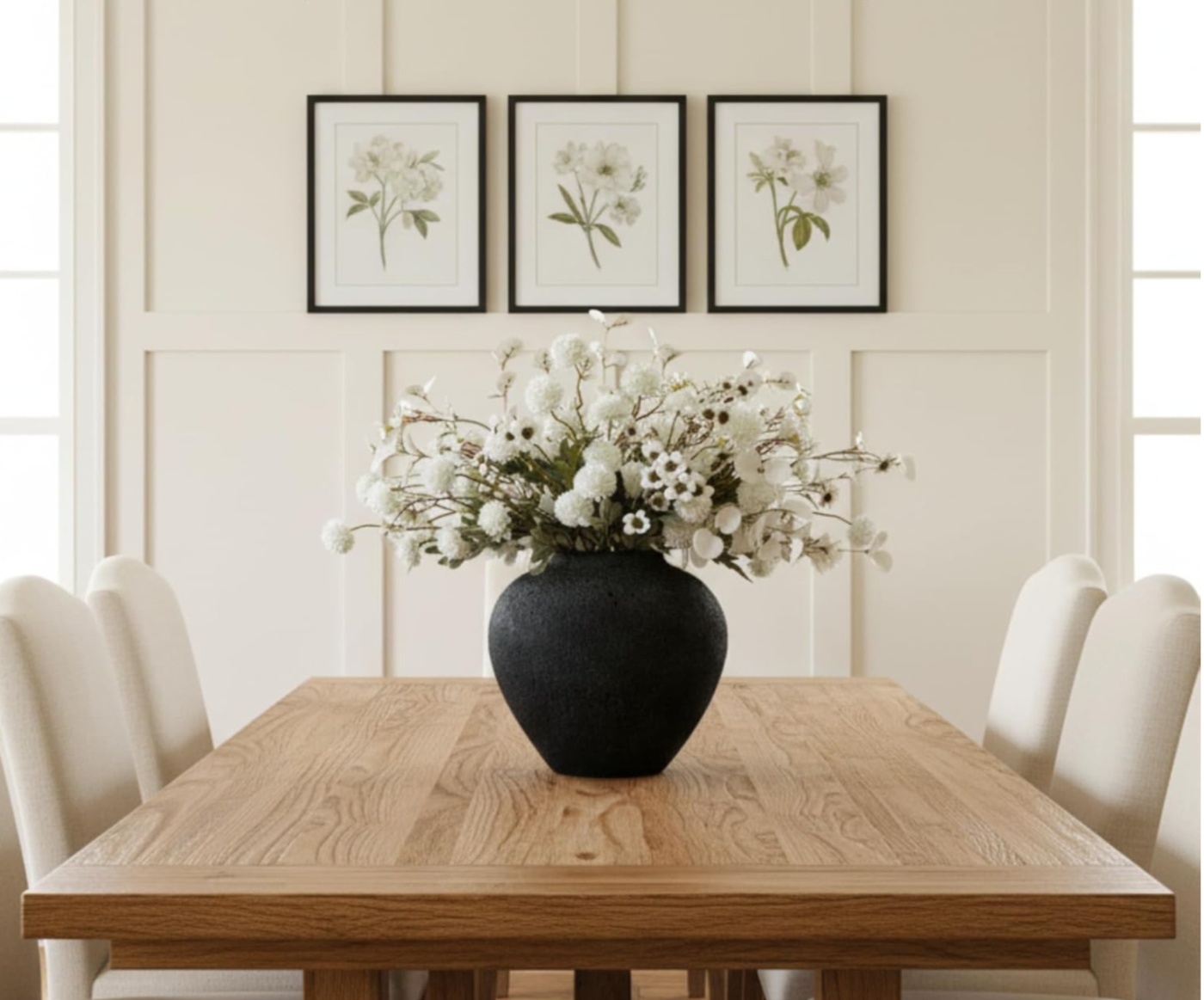 Neutral organic modern dining room featuring a sintered stone dining table, upholstered chairs, linear pendant lighting, textured rug, and sculptural decor.