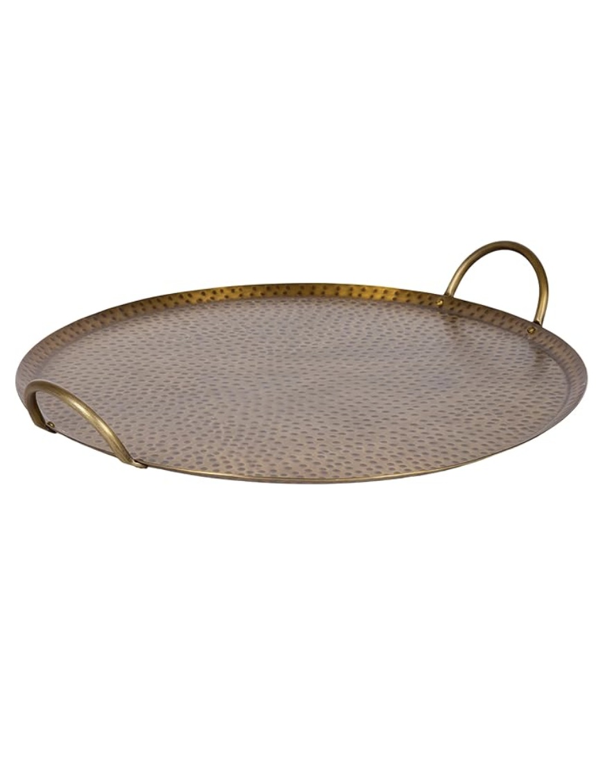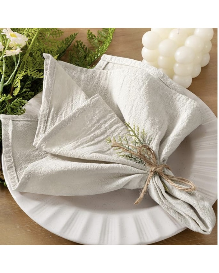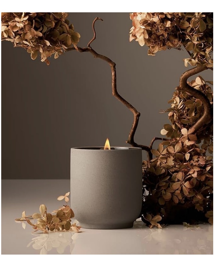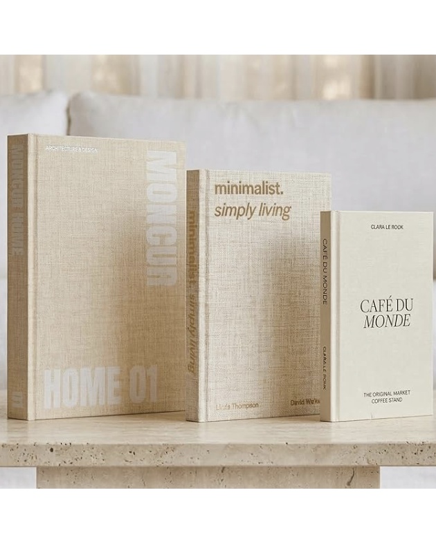 A warm, layered pouf vignette with coffee, candle, books, and brass tray—effortless organic modern styling.