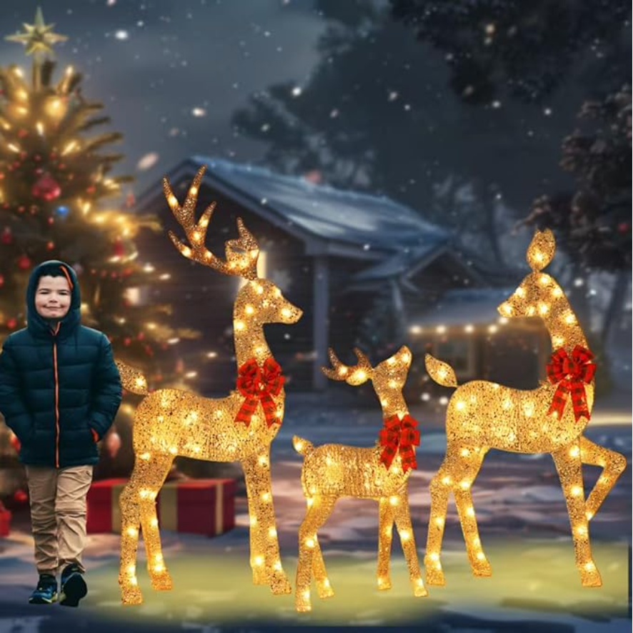 Glowing Christmas reindeer and spiral trees create a warm, magical holiday yard display. Perfect Amazon outdoor décor for festive winter nights.
