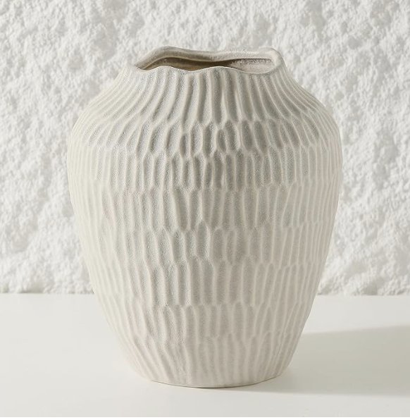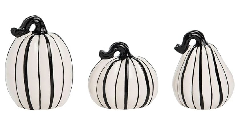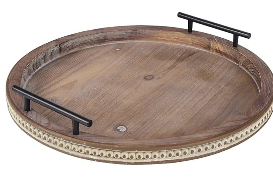 Chic monochromatic fall tray styling with a beaded wooden tray, glass hurricanes, pumpkins, ceramic vase, and cream eucalyptus stems.