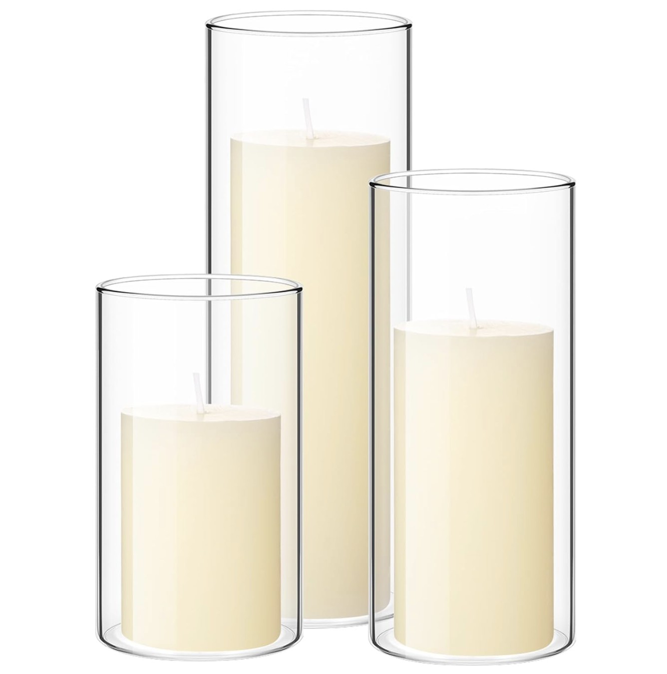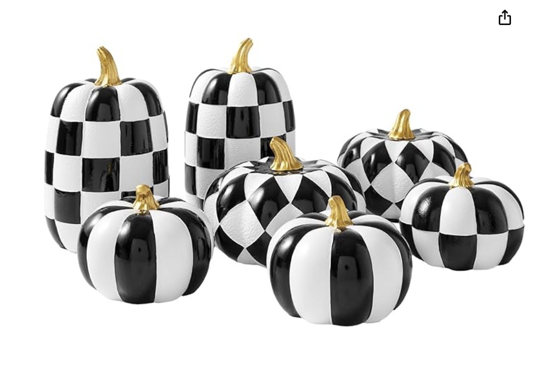 Organic-modern fall plank centerpiece with glass hurricanes, ivory candles, black-and-white pumpkins, and olive greenery on a natural table runner.