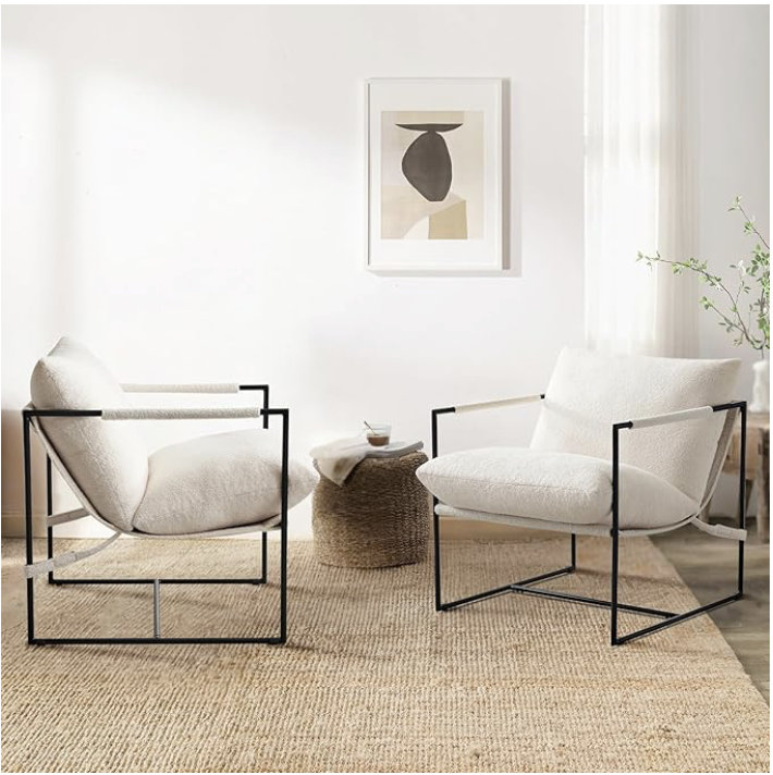Elevated organic modern seating with boucle chairs, textured rug, and warm wood accents for a calm, layered living room.