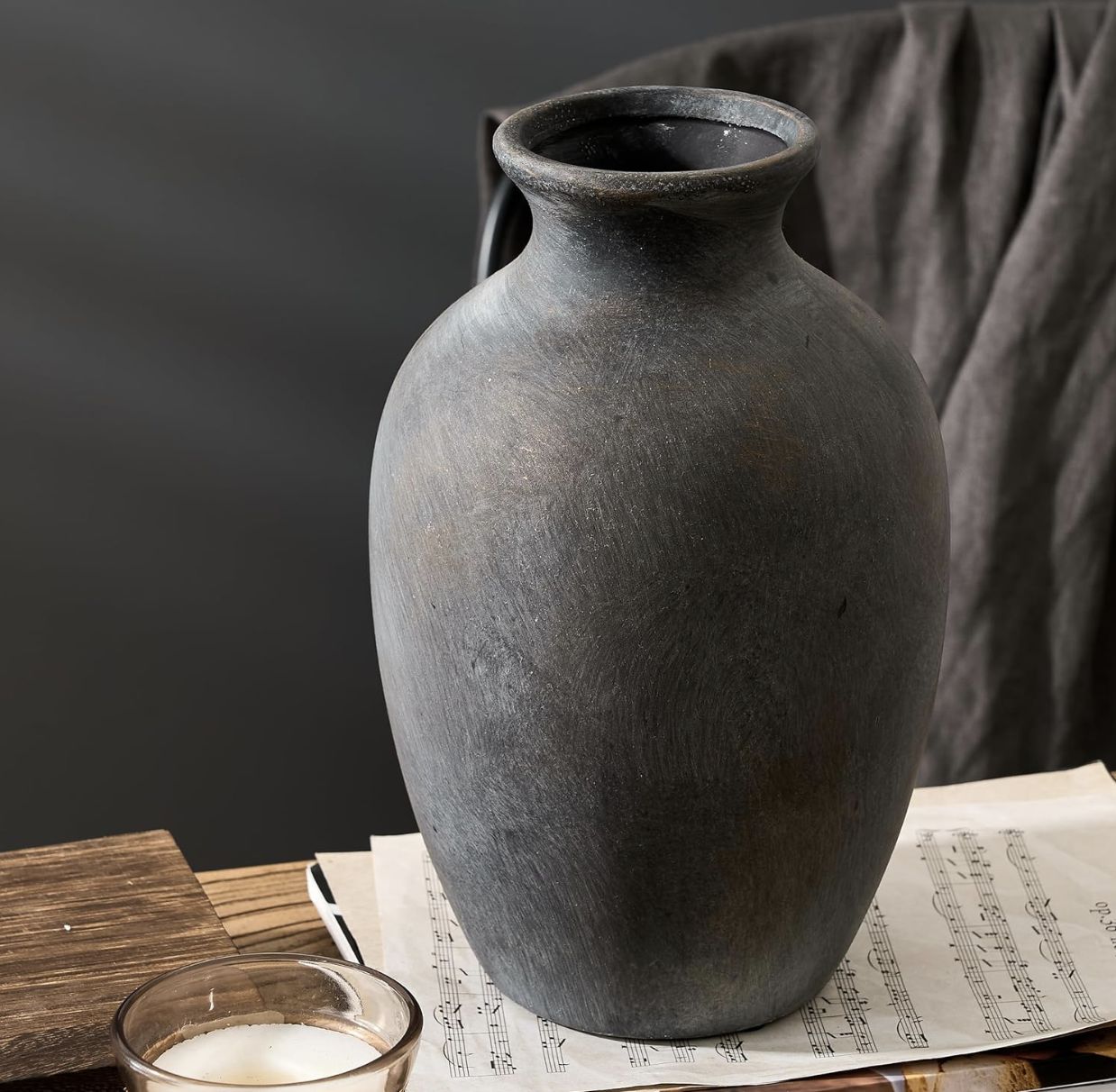 Modern storage cabinet and woven floor vase set — elevate your dining or living space with minimalist black furniture and natural textures.