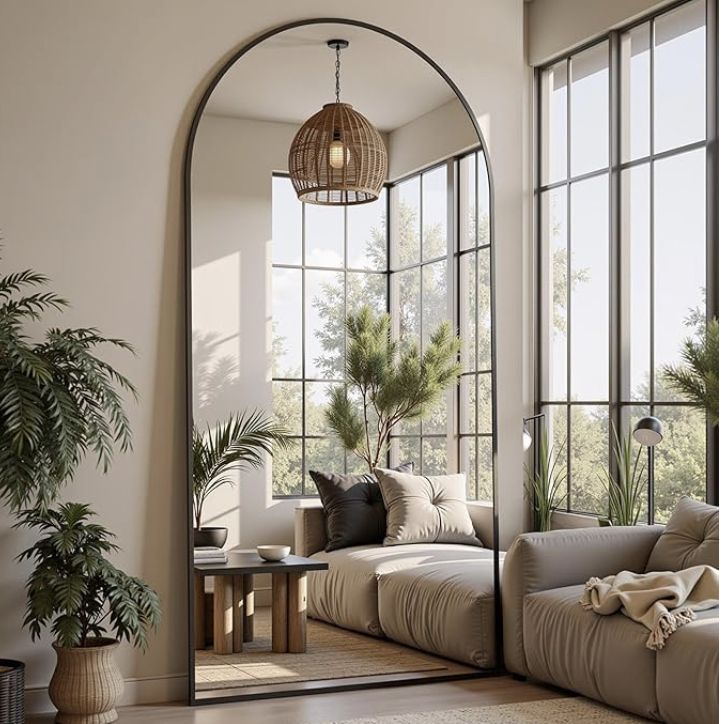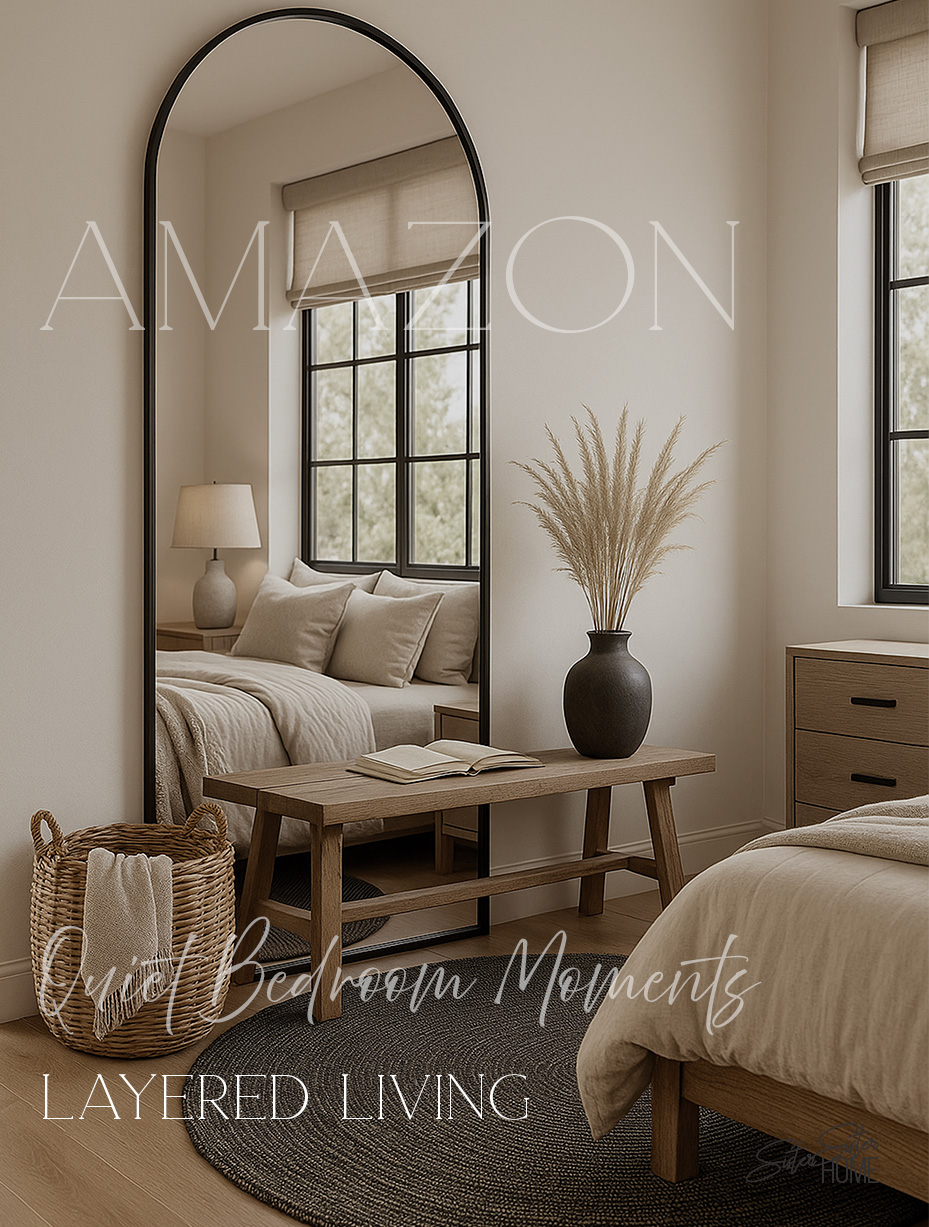 Organic modern bedroom styling with layered textures — arched mirror, warm woods, and soft neutrals for a serene, Designer-inspired retreat, all from Amazon