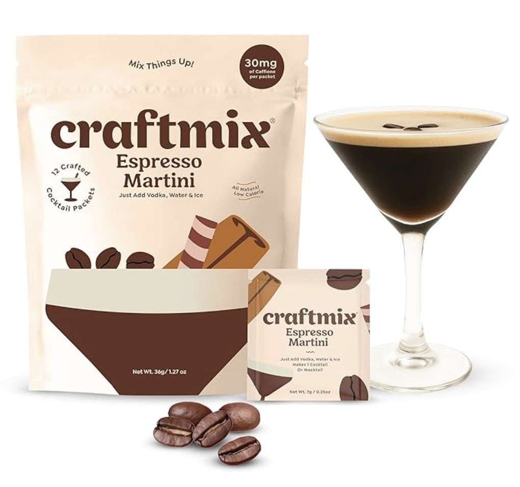 Craftmix Espresso Martini Mix with chic martini glasses and a stainless steel shaker makes it simple to craft smooth, bar-quality cocktails at home.
