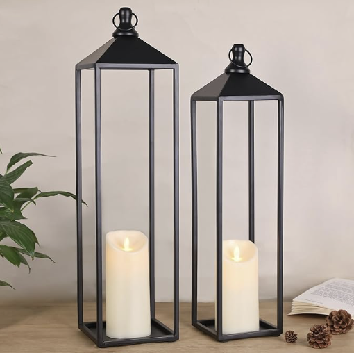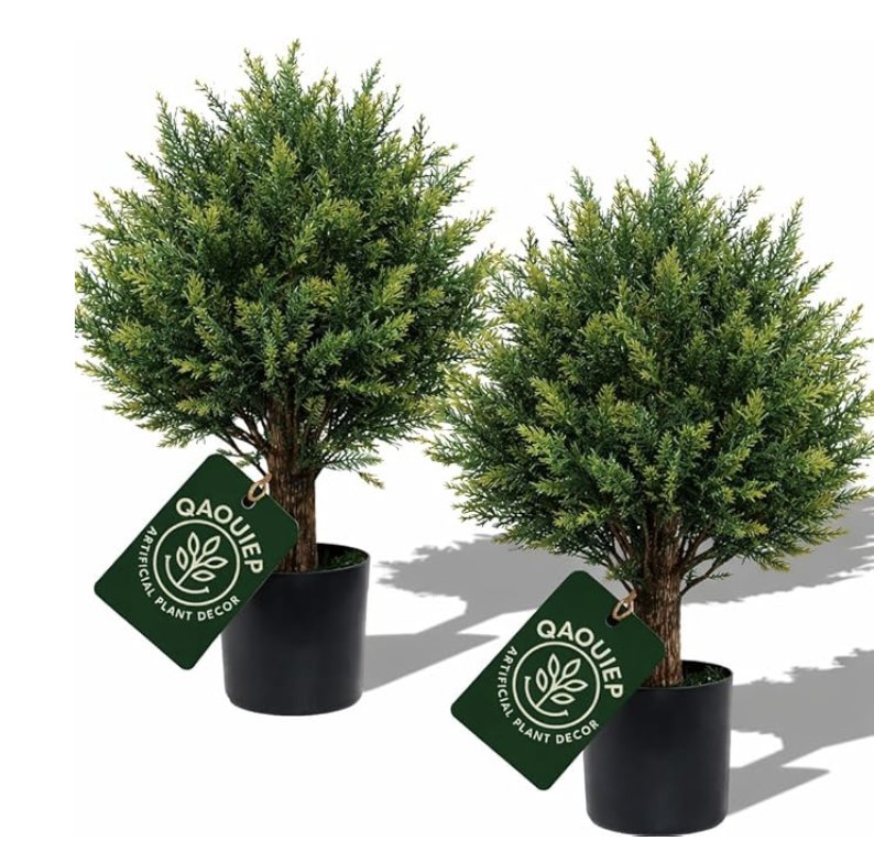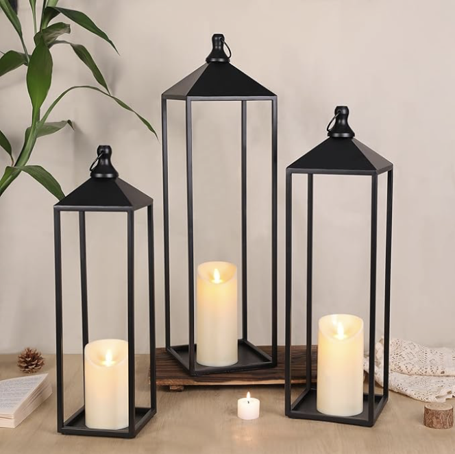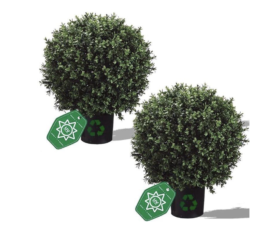 Organic modern spring porch refresh with black door, topiary trees, lanterns, and neutral outdoor styling for a warm, inviting entry